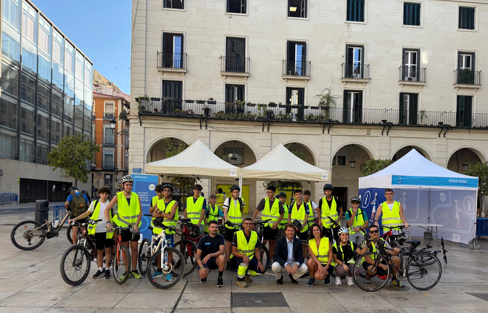 Alicante, 19 de septeimbre de 2025. Un centenar de alumnos de educación secundaria de los IES Las Lomas, Mare Nostrum y Playa San Juan han participado este viernes en una nueva edición de la Biciescuela, una actividad enmarcada dentro de la Semana Europea de la Movilidad que se celebra en Alicante entre el 16 y 22 de septiembre. Los estudiantes se han familiarizado durante esta actividad con el manejo de la bicicleta realizando una ruta por la ciudad, que ha finalizado en la plaza del Ayuntamiento y que ha contado con colaboración de la Brigada Ciclista de la Policía Local.