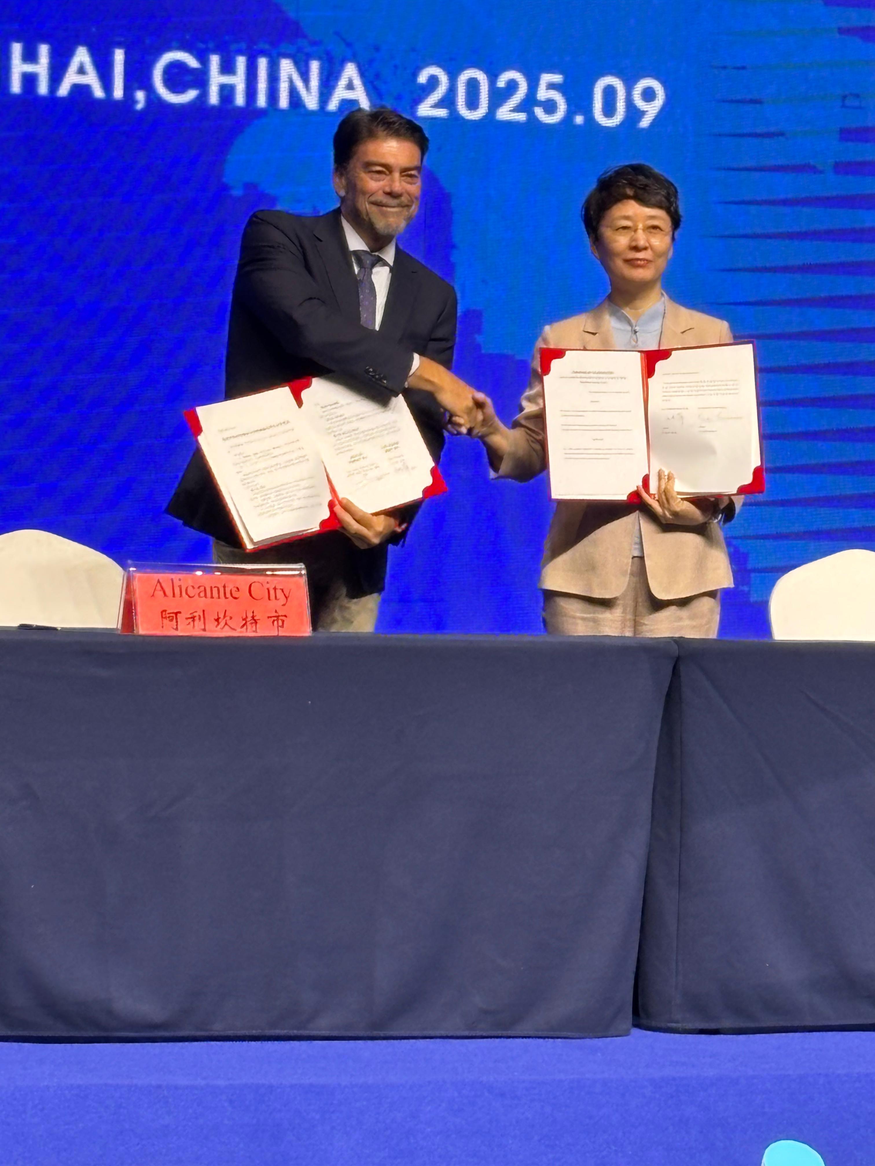 Alicante, 23 de septiembre de 2025. El alcalde de Alicante, Luis Barcala, y su homóloga de la ciudad china de Weihai, Kong Fanping, han firmado este lunes un convenio de colaboración para estrechar sus lazos de amistad y cooperación e impulsar iniciativas conjuntas en los ámbitos económico y comercial, cultural, turístico y deportivo. La firma de esta alianza se enmarca en la participación de Barcala en el tercer Foro Internacional de ciudades sostenibles celebrado en esta urbe del extremo oriental de la península de Shandong, con casi tres millones de habitantes y 2.000 empresas con inversión extranjera, y en la misión comercial e institucional que ha encabezado el primer edil para captar inversiones para Alicante.