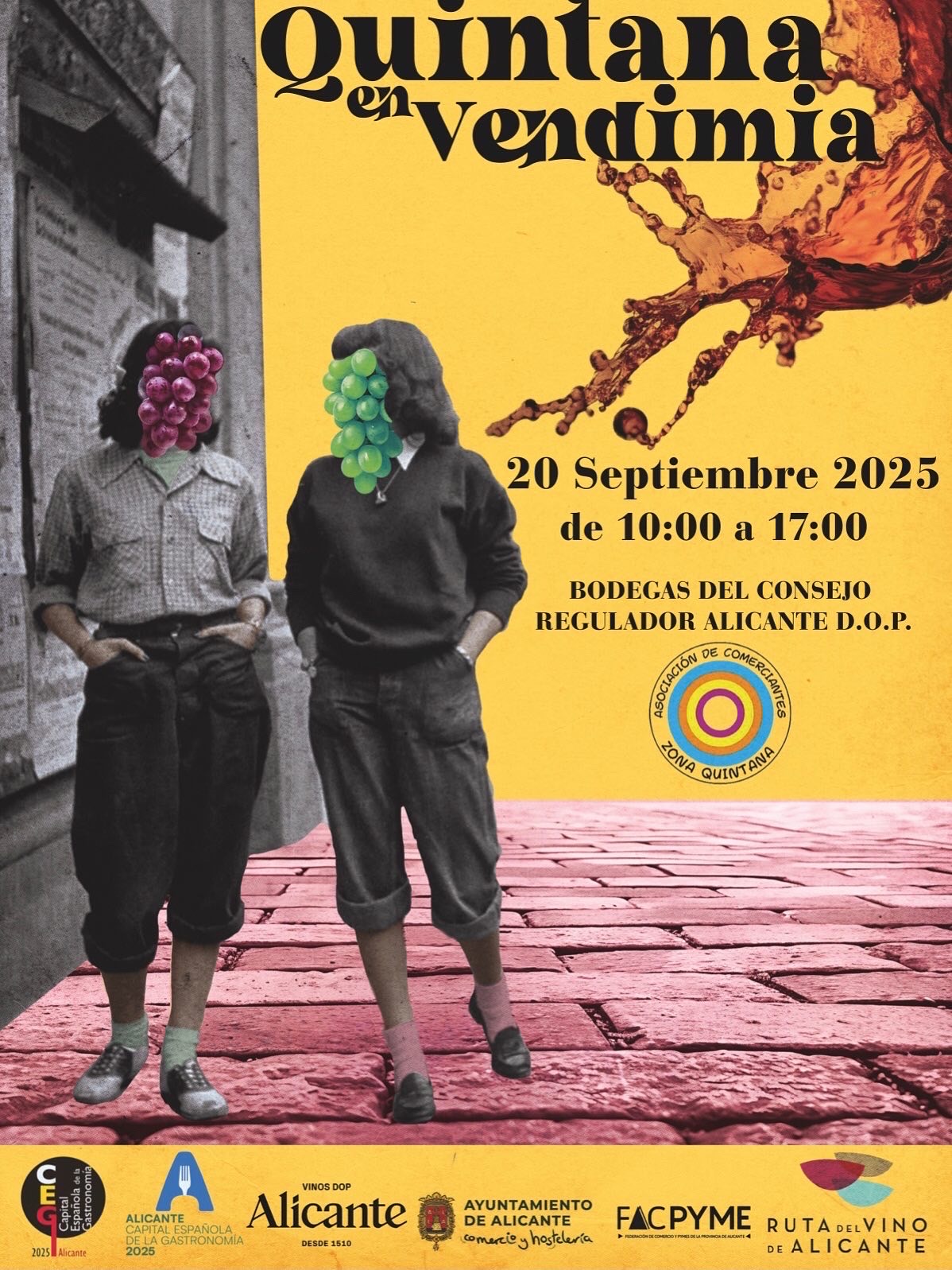 Alicante, 19 de septiembre de 2025. Alicante invita este sábado 20 de septiembre a participar en la segunda edición de ‘Quintana en Vendimia’, una jornada de dinamización comercial organizada en la calle Poeta Quintana, que tendrá lugar de 10 a 17 horas, y llenará la zona de catas de vino, gastronomía y actividades para todos. En la cita se podrán degustar los mejores vinos Denominación de Origen Protegida de treinta bodegas de Alicante, el doble de la primera edición, para darlos a conocer y disfrutar de un evento con música en directo, talleres para los más pequeños y los establecimientos comerciales también sacarán sus productos con ofertas a la calle y se ofrecerán degustaciones de alimentos de Alicante.