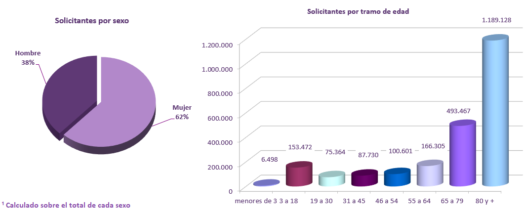 Los datos que arroja el Sistema para la Autonomía y Atención a la Dependencia muestran una clara tendencia de sexo y edad: las mujeres son quienes más solicitudes presentan, en concreto, aquellas con una edad de 80 años en adelante. Porcentualmente, las mujeres representan el 62% del total de las personas solicitantes, respecto a un 38%, de hombres. Trasladándose a números, de 2.272.565 solicitantes de la prestación, 1.408.385 son mujeres y 864.180 son hombres. Por edad, las personas mayores de 80 conforman el grupo más numeroso (1.189.128 personas, lo que representa el 52,33% del total). Dentro de este grupo de edad, el 61% son mujeres y el 39% hombres.