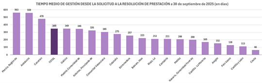 El tiempo medio de gestión se sitúa en 349 días, un dato que supone una ligera subida respecto a junio (342 días), pero mantiene una reducción de 57 días respecto al pico alcanzado en el año 2021. El tiempo medio de tramitación de las prestaciones muestra avances frente a los niveles alcanzados en los últimos años, pero continúa siendo el principal reto del Sistema. Las comunidades con mejor desempeño en este indicador son Ceuta (66 días), Castilla y León (113) y País Vasco (130), y casi todas las comunidades han logrado reducir el tiempo medio de tramitación, lo que demuestra que es posible acortar los plazos de manera significativa.