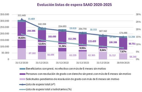 En plena presión demográfica y aumento de solicitudes para una prestación, la lista de espera sigue reduciéndose y se sitúa en 174.406 personas, lo que implica un descenso del 9,8% sobre 2024
